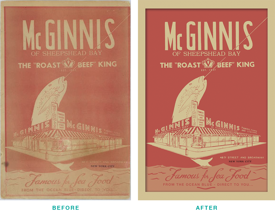The backstory for this project is sweet. The client proposed to his wife at this restaurant in New York City and wanted his vintage restaurant menu cover restored as an anniversary present for her. From research online, McGinnis' seems to have opened in the late 1930's and closed in the late 1960's.